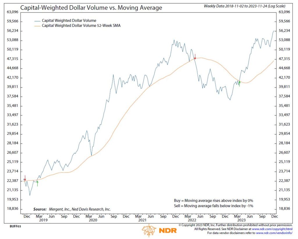 Positive momentum extended to market breadth, evident in the advancing Advance Decline Line, which is steadily approaching trendline resistance. Capital Weighted Dollar Volume achieved new all-time highs, and notably, Capital Weighted Volume is now on the verge of reaching historical peaks as well.