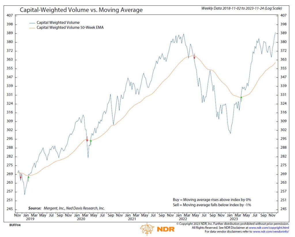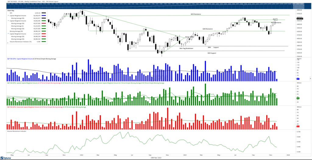 Looking ahead, minor SPX resistance is anticipated at the July highs of 4607, followed by more substantial resistance at 4635. The former S&P 500 resistance level of 4527 now acts as short-term support, while intermediate support is situated at 4475. The ongoing strength in Capital Weighted Volume and Dollar Volume demonstrates capital flows into the equity market appear to remain strong.