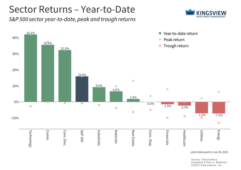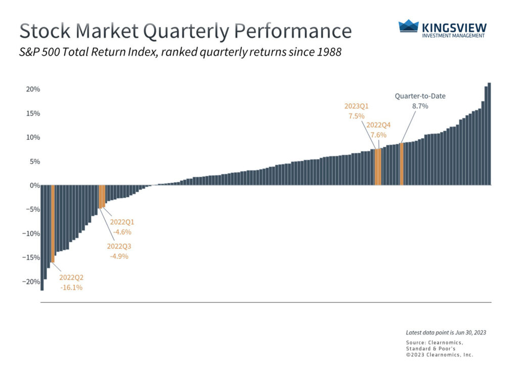 The S&P 500 has now notched three consecutive quarters of strong returns, beginning with the fourth quarter of 2022. This is a 180-degree shift from the bear market returns experienced during the first three quarters of last year, and is happening at a time when sentiment is still negative. While there is no guarantee that markets will continue on this strong trajectory, it underscores the idea that markets can change direction without notice.
