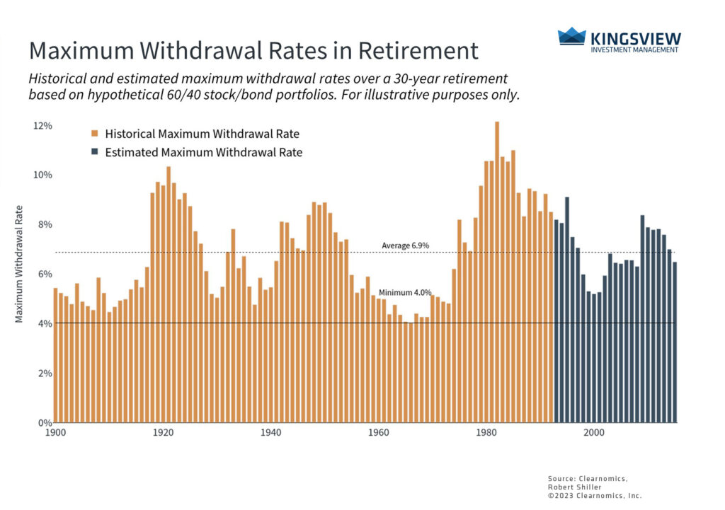 Many investors may wonder what market uncertainty means for their portfolios, especially for those approaching retirement. The classic 4% rule specifies a “safe” withdrawal rate in retirement based on the historical performance of a hypothetical 60/40 stock/bond portfolio, as shown in the accompanying chart. This includes both good and bad market periods since 1900.