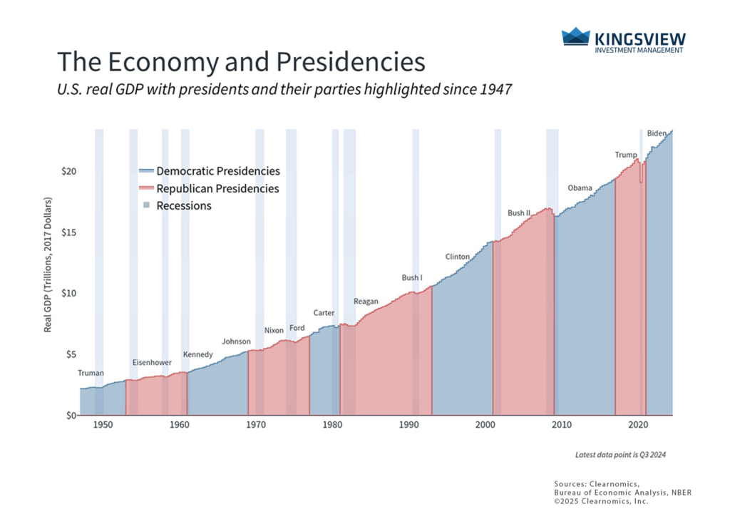 When it comes to markets and the economy, presidents tend to receive too much credit and blame. History shows that economic growth and market rallies have occurred across both parties. This is because who occupies the White House is often less important than the decades-long business and market cycles that happen to be taking place.
