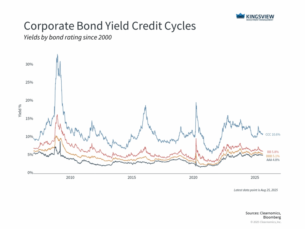Today’s market environment suggests this confidence remains strong. One of the clearest signals of market confidence comes from corporate bond markets, where credit yields and spreads have reached their lowest levels in years, as shown in the chart above. High-yield spreads have similarly tightened, indicating that investors are comfortable taking on corporate credit risk. This is consistent with major stock market indices reaching new all-time highs due to investor confidence.