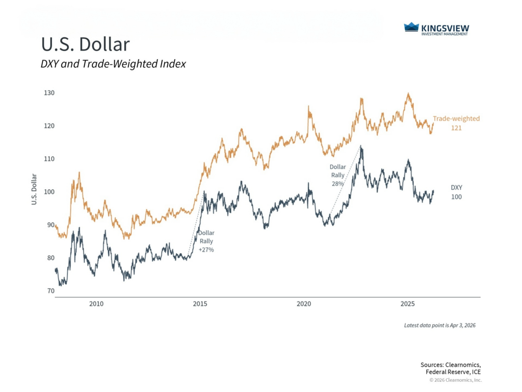 Global events have been at the center of financial market activity, with high oil prices, geopolitics, and new tariff rules capturing investor attention. Behind many of these trends, however, is the level of the U.S. dollar. While currency movements have received less attention in recent weeks, they continue to have important effects on portfolios by influencing international investments, commodities like gold, and the broader economic environment.
