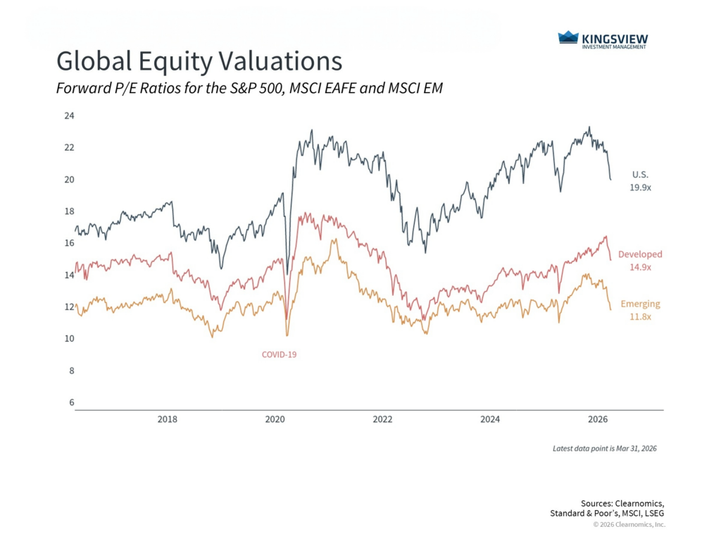 Beyond currency effects, valuations also play an important role. International markets have traded at a meaningful discount to U.S. equities for some time, with developed markets trading with a price-to-earnings ratio of 14.9x and emerging markets 11.8x, compared to 19.9x for the S&P 500. This does not predict returns over the short run and is thus not a timing indicator. Instead, this difference in valuations is an important input into constructing balanced portfolios when deciding how to weigh different assets.