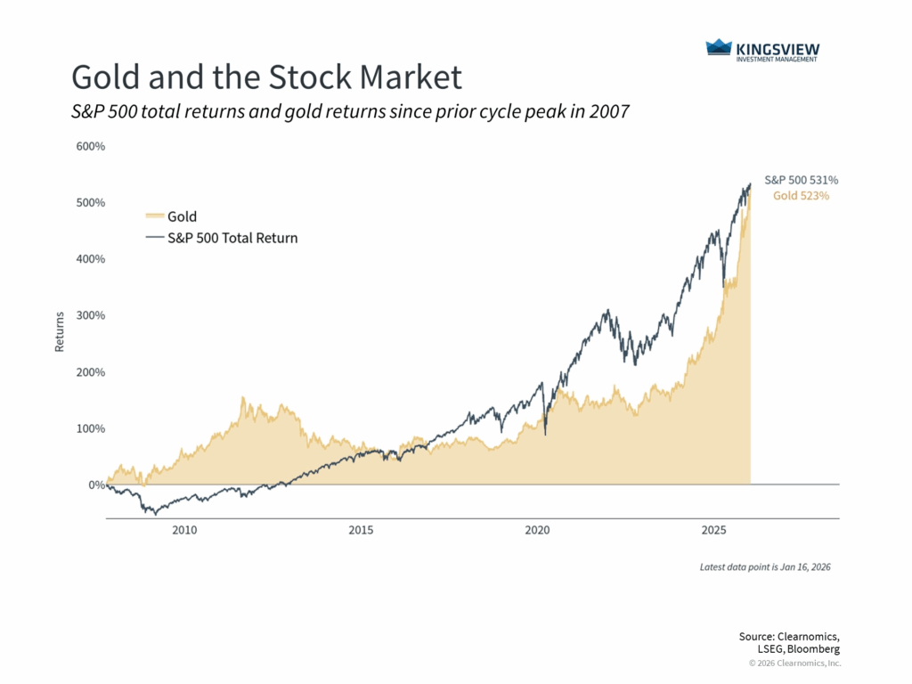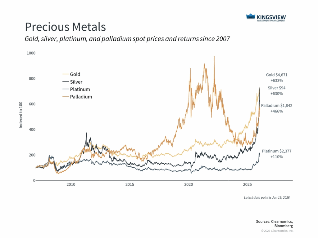 Gold, silver, and other precious metals have rallied over the past two years, capturing investor attention. Gold recently surpassed $4,700 per ounce while silver now trades above $90 per ounce, marking historic milestones for both metals. This strong recent performance may lead some investors to wonder whether they should be investing in these assets. As with all investments, it’s important to maintain a broader perspective to understand their history and how they fit into a well-constructed portfolio.