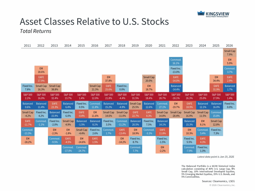 The accompanying chart shows that many asset classes have contributed to portfolio returns recently, not just precious metals. While gold and silver have certainly performed well, there will always be individual investments that shine in particular periods. The key is constructing portfolios that can benefit from various market conditions rather than concentrating on recent winners.