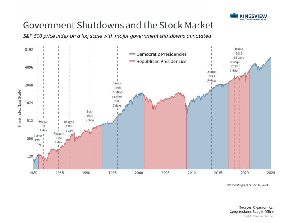 As the accompanying chart shows, government shutdowns have occurred regularly since 1980 under presidents of both parties, with minimal long-term impact on financial markets. The chart illustrates that this was true even during the most contentious shutdowns, including during the Reagan administration, Clinton’s 21-day shutdown in 1995, Obama’s 16-day shutdown in 2013, and Trump’s 35-day shutdown in late 2018 to early 2019 – the longest on record. For investors, shutdowns have generally served as temporary disruptions rather than fundamental threats to economic growth.