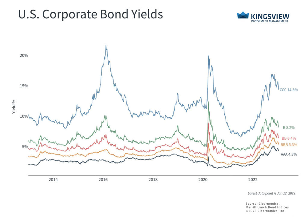 So, while consumer prices are still 6.5% higher compared to the year before, this is a backward-looking number since many price categories are improving. Treasury Inflation-Protected Securities (TIPS) are now being priced based on the expectation of only 2.2% annual inflation over the next 5 and 10 years. Inflation is a scourge on bonds since higher consumer prices cause investors to demand higher interest rates. The recent reversal has allowed interest rates to ease and increases the likelihood that the Fed will pause its rate hikes later this year, brightening the economic outlook.