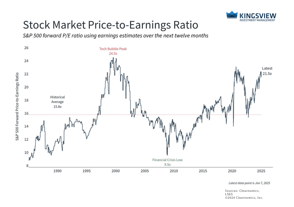 Perhaps the most significant difference investors face this year is that stock market valuations are well above average. As the accompanying chart shows, the price-to-earnings ratio for the S&P 500 is 21.5x, near its highest level in recent years and not far from the all-time peak of 24.5x during the dot-com bubble. In fact, some investors wonder if there is a market bubble today, or at least one in AI stocks.