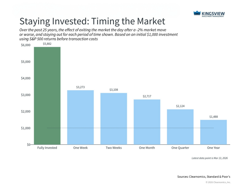 This is the foundation of why staying invested has historically been the best approach for long-term investors. Some may be tempted to time the market, but the challenge is not just knowing when to get out, but also when to get back in. The accompanying chart illustrates that even missing a single week after volatile days has historically been negative for investment outcomes. While there are no guarantees, this is historically because the market’s best days have occurred shortly after its worst days. Investors who stepped to the sidelines missed the very rebounds they were waiting for.