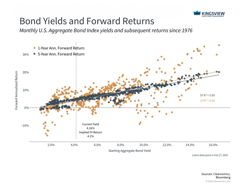 Perspective is needed since bonds have contributed positively after their historic pullback in 2022, when inflation and interest rates rose swiftly, generating strong returns from 2023 to 2025. Since the bottom in October 2022, the broad bond market has generated roughly 20% in total returns, with some individual sectors performing even better.
