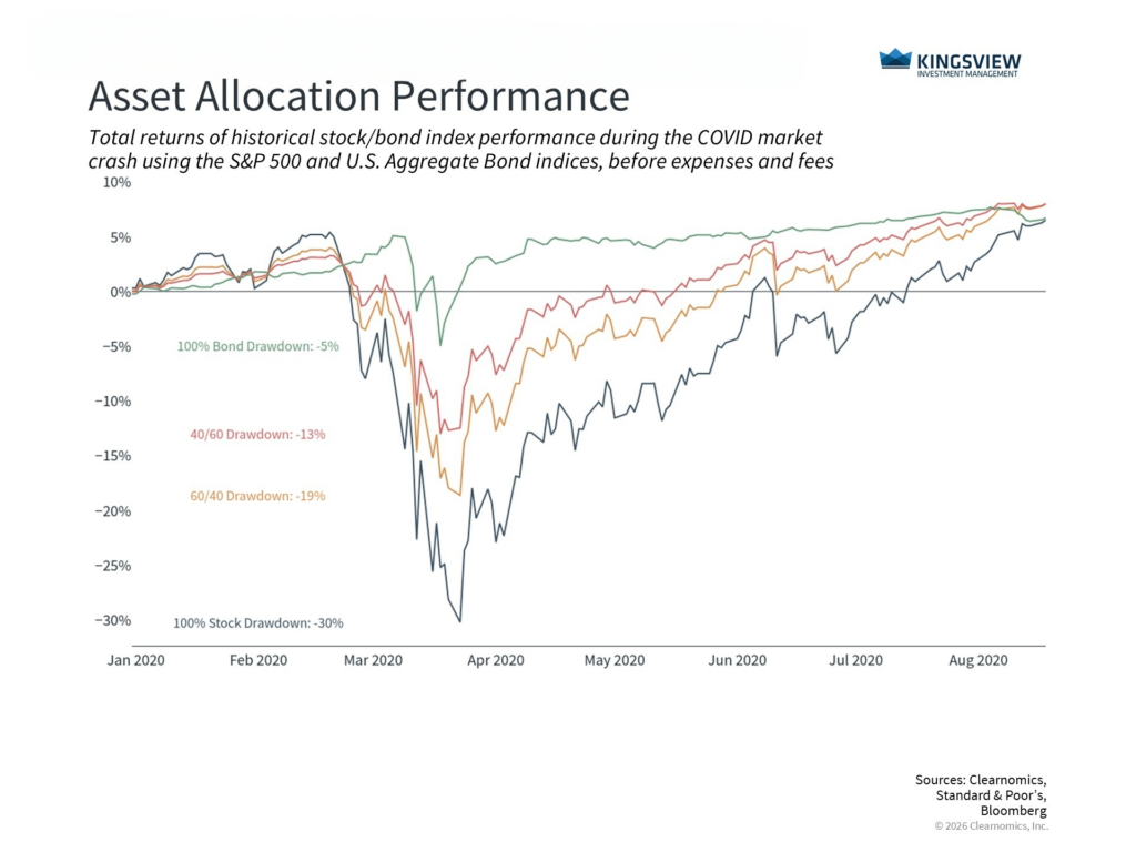 The accompanying chart highlights one of the most volatile periods in history during the pandemic in 2020. Different asset allocations behaved in unique ways, with those that were more balanced across asset classes experiencing smaller swings. While these portfolios all ended around the same level after this period, the real issue is whether investors would have overreacted when the stock market was down 20% or 30%.