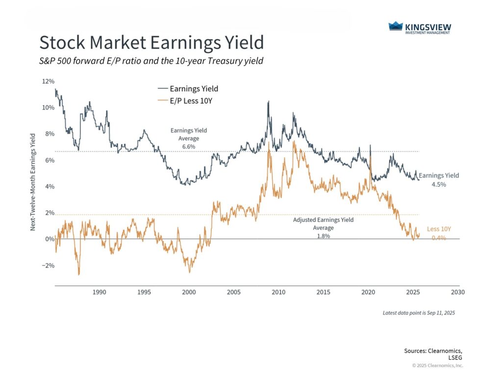 The accompanying chart shows a related concept known as the “earnings yield,” sometimes referred to as the “equity risk premium.” This measures how attractive stocks are compared to Treasurys. This downward trend in recent years is a result of stocks climbing to new highs and higher interest rates. The fact that interest rates have hovered in a range more recently is why the relative earnings yield has stabilized this year.
