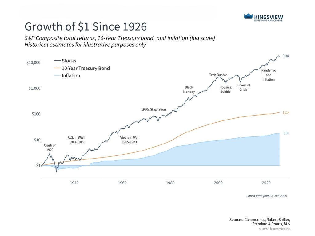 The accompanying chart shows that $1 invested in stocks in 1926 grew to approximately $18,000 by 2025, demonstrating the power of compound growth over long periods. This growth came from both dividends and price appreciation, but the specific mix varied across different time periods. During some decades, dividends provided most of the return. In others, stock price appreciation dominated. What remained constant was the importance of staying invested through various market cycles, regardless of what drove returns.