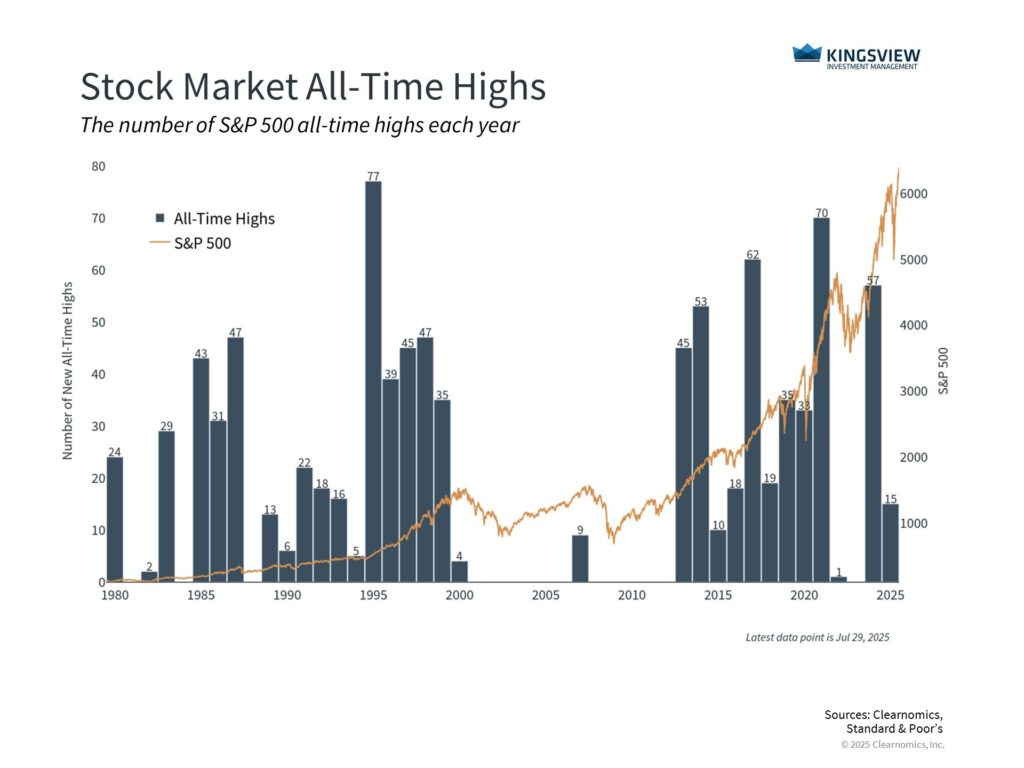 Markets have continued to reach new all-time highs as earnings beats are reported and new trade deals are announced. As the chart above illustrates, the S&P 500 has reached over a dozen new record highs this year, most of which have been achieved over the past month. The Nasdaq has also hit record levels, topping its historic peak from last December, and the Dow is near a new record as well. Although markets at these levels may make some investors nervous, the reality is that major indices can reach many new all-time highs each year during market expansions.