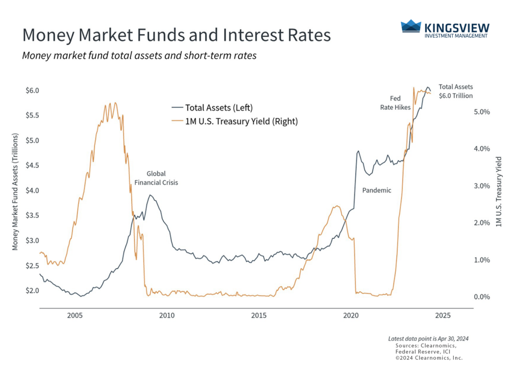 These dynamics have led many investors to hold more cash than in the past. Money market funds, for instance, have attracted inflows with total assets reaching new all-time highs of $6 trillion. This is more than double the assets held in money market funds prior to the pandemic when interest rates were near zero for the better part of a decade. As the accompanying chart shows, money market fund assets have typically grown in times of economic distress or when interest rates have been high.