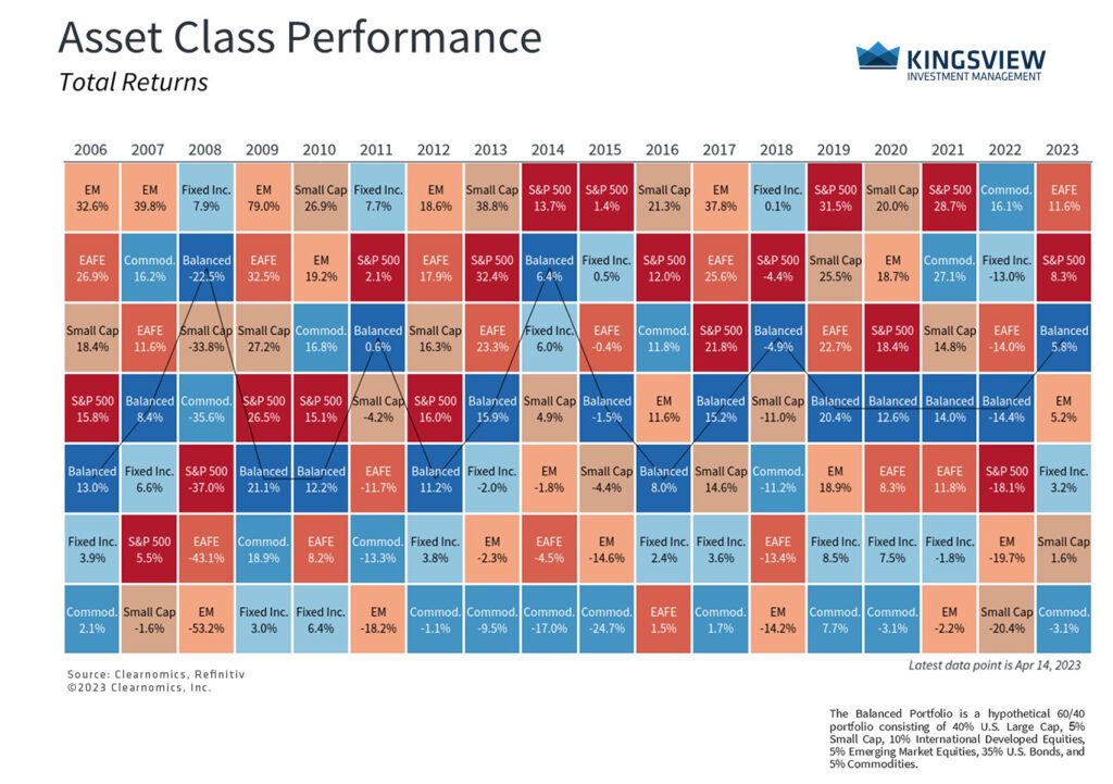 Historical references do not assume that any prior market behavior will be duplicated. Past performance does not indicate future results. This material has been prepared by Kingsview Wealth Management, LLC. It is not, and should not, be regarded as investment advice or as a recommendation regarding any particular security or course of action. Opinions expressed herein are current opinions as of the date appearing in this material only. All investments entail risks. There is no guarantee that investment strategies will achieve the desired results under all market conditions and each investor should evaluate their ability to invest for the long term. Investment advisory services offered through Kingsview Wealth Management, LLC (“KWM”), an SEC Registered Investment Adviser. (2023)
