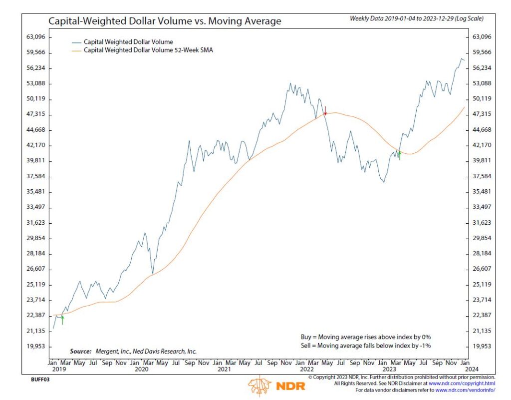 Capital Weighted Volume and Dollar Volume were light on the shortened week. Despite a slight upward movement in the broader markets, both Capital Weighted Volume and Dollar Volume showed declines. The Volume Momentum Indicator (VMI), currently at 29, is approaching levels indicative of a potential washout, suggesting that the market may be overbought. While a robust bull market can push through overbought conditions, a moderate bull market often takes a pause, and a weak bull market typically undergoes a correction. The last instance of VMI reaching this level was on July 29th (VMI 28), highlighting that phase of the bull market as weak.