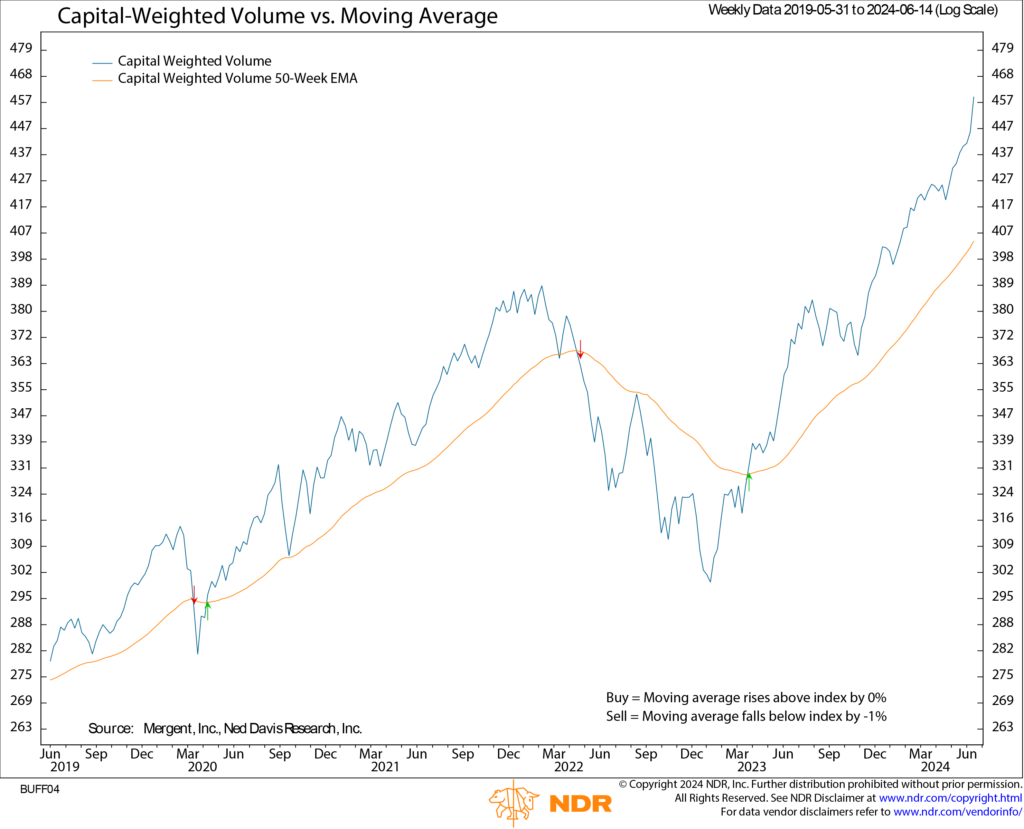 With the Federal Reserve meeting and news of lower-than-expected inflation, Wednesday was one of the most robust Capital Weighted Volume days of recent memory, with over $40 billion changing hands. That tally matches some weekly totals. The vast majority of flows were to the upside—over 91%—marking another Upside Capital Weighted Volume Thrust day. The rest of the week’s volume remained strong but was more fairly distributed between upside and downside volume.