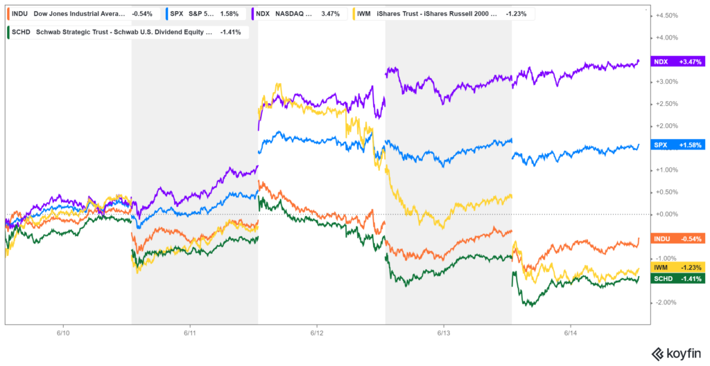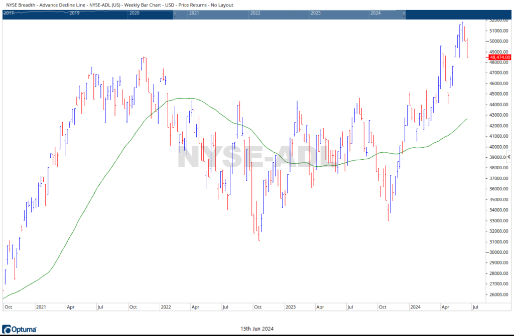 While the mega-caps sprang into hope, parts of the broader markets continued their slide into despair. In many ways, this action is counterintuitive, given the backdrop of falling bond yields and lowered inflation expectations. The fundamental textbooks might suggest such conditions favor the troops. However, the NYSE Advance-Decline fell back down to its May lows. Meanwhile, many of the high and modest-yield dividend stocks continued their season of darkness this quarter. This is evidenced by one of the largest dividend ETFs, the Schwab US Dividend Equity ETF (SCHD), falling -1.41%. Both the troops (IWM) and the NYSE AD Line are nearing their intermediate-term support levels. Forthcoming near-term action could predicate the course of summer trading.