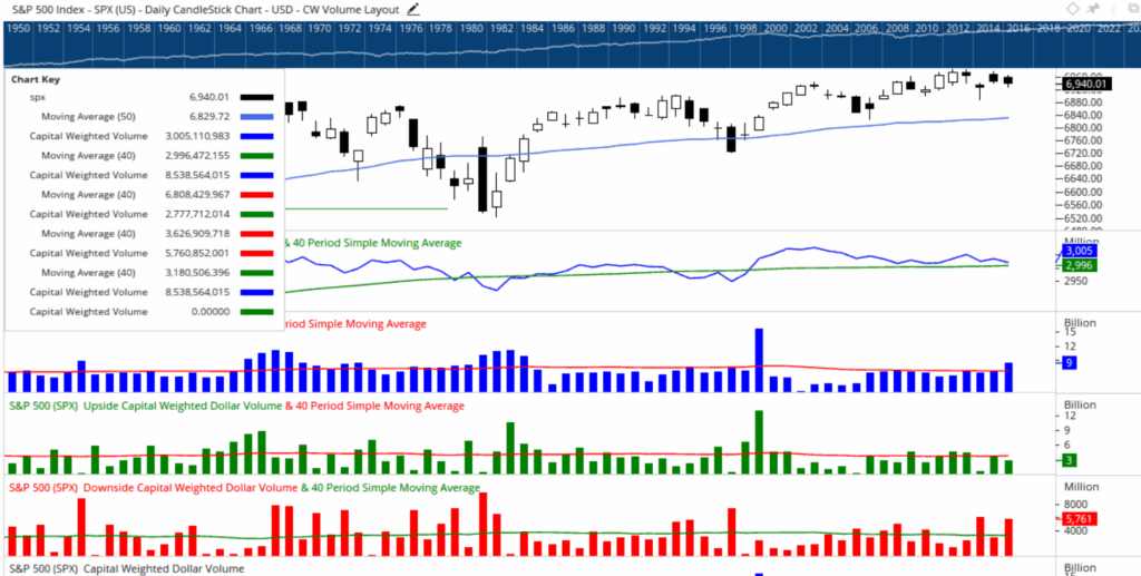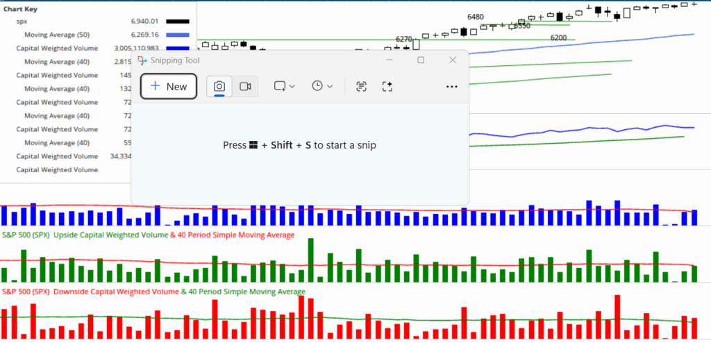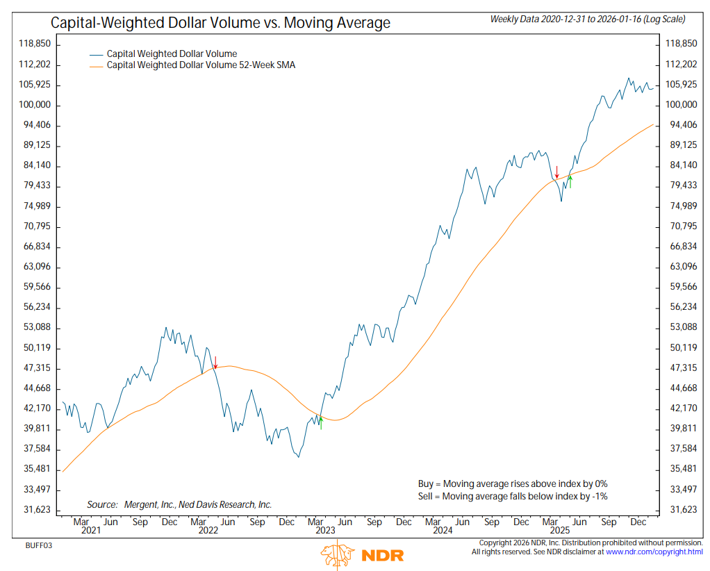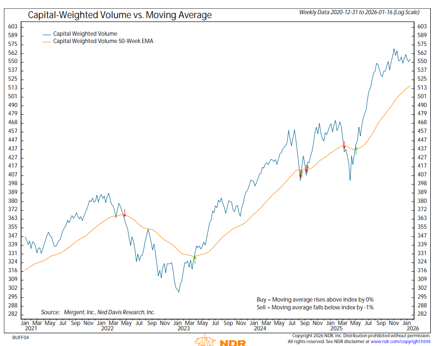 For the week, S&P 500 Capital Weighted upside and downside volume finished essentially even on average volume, signaling near parity between buying and selling pressure. Capital Weighted dollar flows, however, leaned defensive, with 62% of flows to the downside. Much of this imbalance occurred on Wednesday the 14th, when downside volume reached 89% of total activity on a modest volume day. Importantly, downside volume was only slightly above average, suggesting the move was driven more by an absence of demand than by aggressive supply.