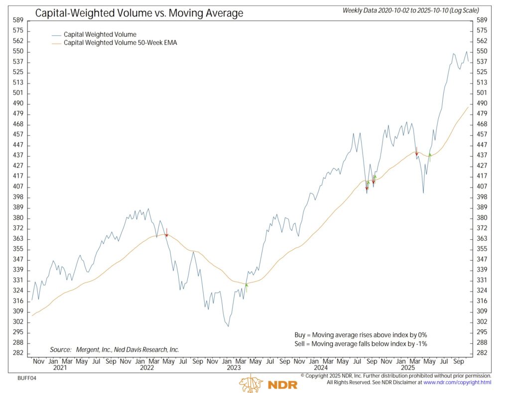 Both the accumulated trends of Capital Weighted Volume and Capital Weighted Dollar Volume turned lower on the week, signaling a pause in momentum, though both remain well above their prior lows and above their long-term uptrend lines. S&P 500 Capital Weighted Dollar Volume registered modestly elevated readings, with 60% of flows classified as outflows. Capital Weighted Volume, meanwhile, came in only near its weekly average, with 62% of the activity weighted to the downside, evidence of investor profit taking rather than institutional panic.