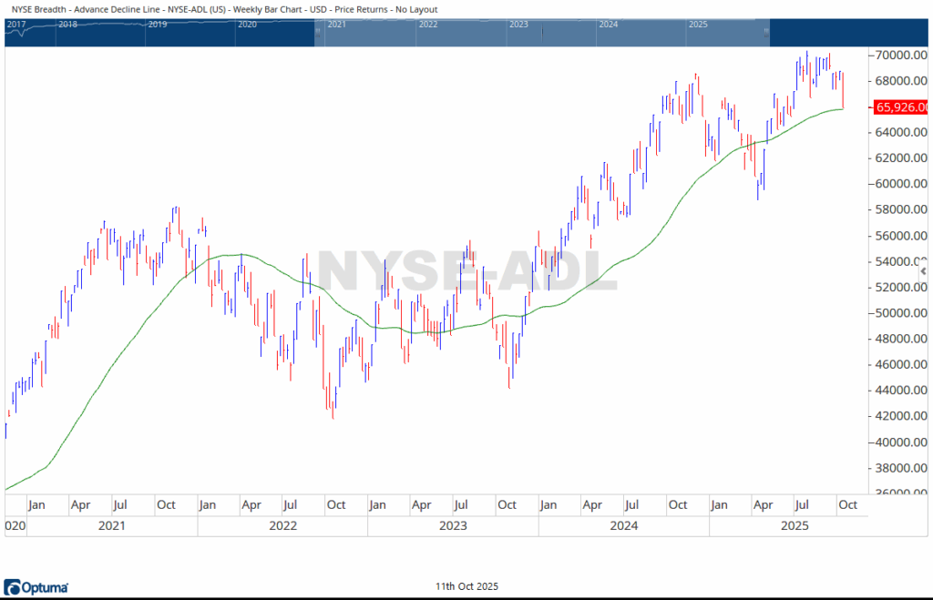 Beneath the surface, however, market participation weakened. The NYSE Advance–Decline Line breached not only its September lows but also August’s, illustrating that the broader formation has lost some depth. Even so, the measured move managed to close just above its 50-week moving average, holding the line of long-term trend support. Looking ahead, the next tactical levels for the S&P 500 include near-term support at 6480, with major reinforcements positioned at 6200.