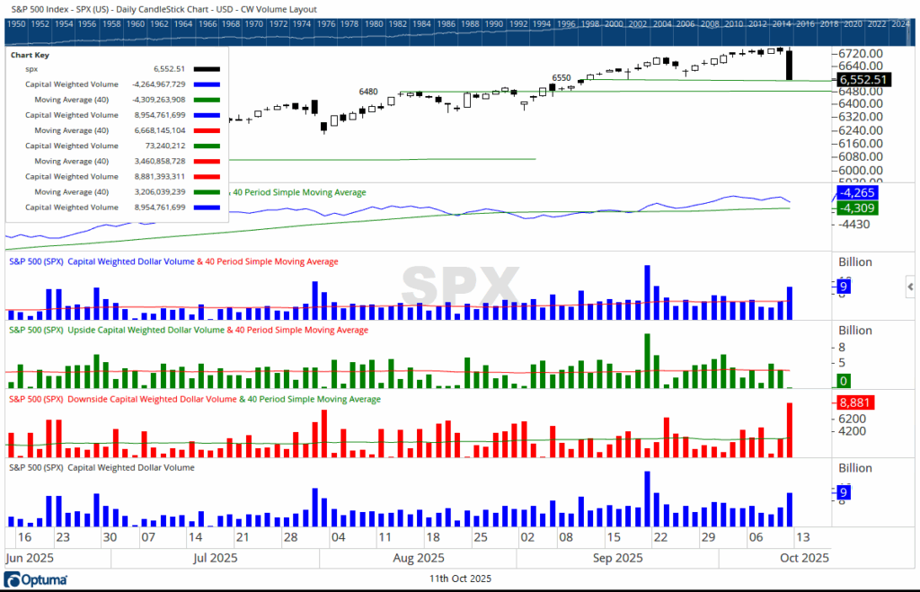 On October 10, 2025, the S&P 500 fell -2.71%, with an overwhelming 98% of Capital Weighted Volume to the downside. While overall volume surged well above average, selling pressure did not match the intensity of the upside breakout sessions from mid-September’s offensive. The index closed near the 6550 support zone, a key defensive position for the current campaign.