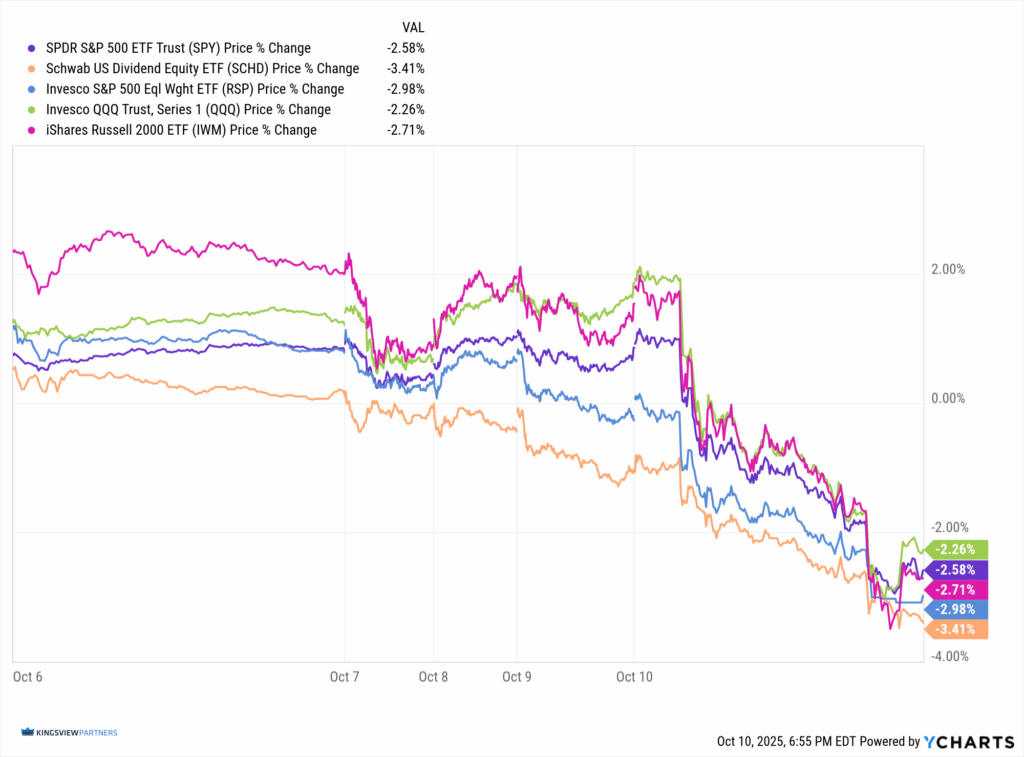 The markets came under heavy fire Friday as renewed fears of a U.S.–China trade conflict rattled investors and triggered a widespread selloff. After a 400-point September advance, the S&P 500 had marched deep into extended territory, leaving supply lines thinner and sentiment shaken. The result was a swift and decisive pullback.