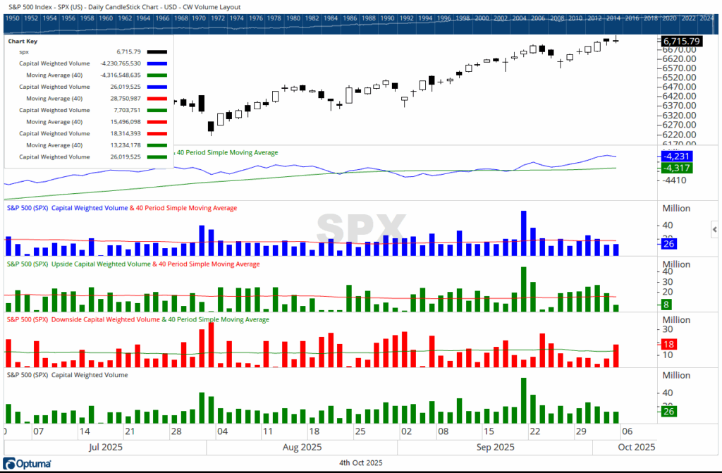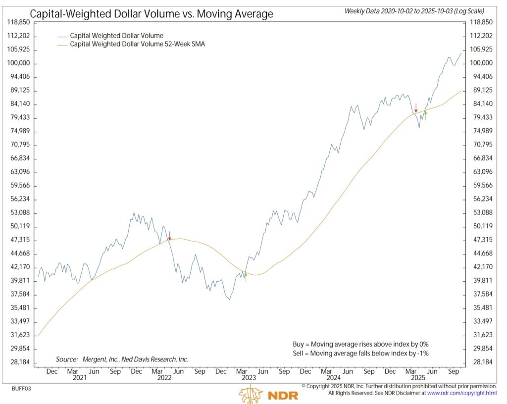 Capital flows were well above average, with 66% of weekly movement to the upside. Inflows surged solidly above trend while outflows slipped modestly below average. Capital-Weighted Volume registered at average levels, but within that balance, upside volume ran a bit above average and downside volume fell well below. In total, 71% of the week’s trading volume was to the upside, underscoring that buying conviction remains firmly in command.