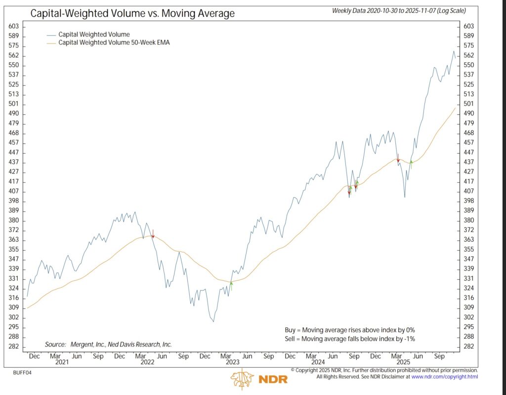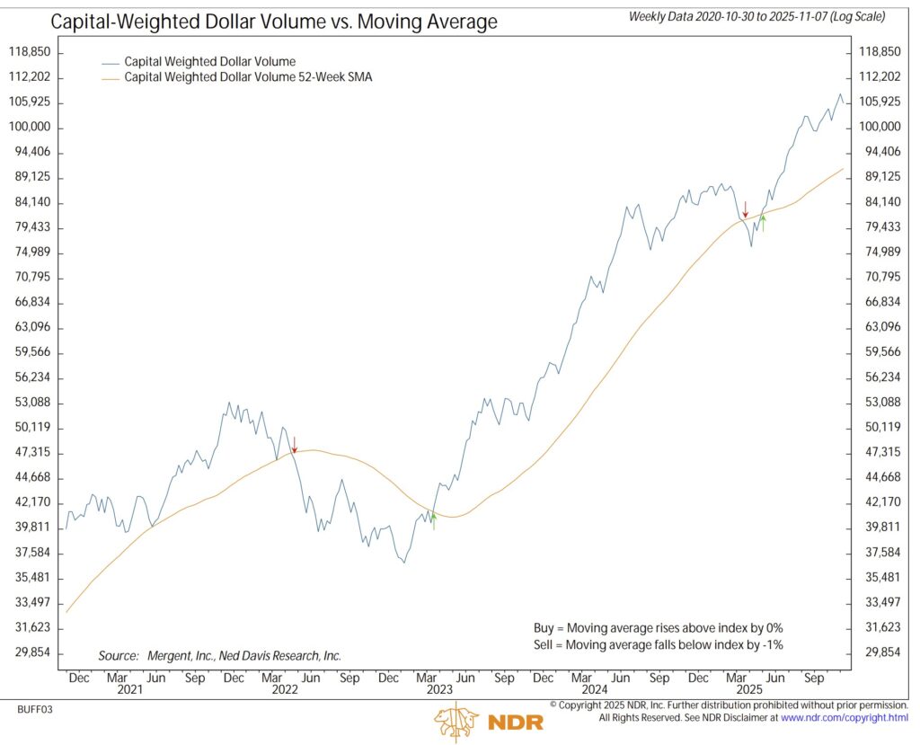 Even with accumulated capital-weighted volume and capital-weighted dollar volume both turning sharply lower, each continues to make higher highs and higher lows, remaining well above trend and signaling the underlying strength of this bull market’s longer-term logistics.