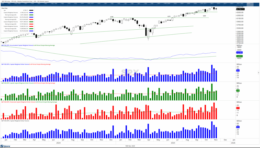 From a capital flow perspective, both inflows and outflows were above average on the week. The ratio of 53% inflows to 47% outflows suggests that, while the front lines remain contested, buying pressure continues to overmatch selling intensity. Meanwhile, both upside and downside capital-weighted volumes tracked near their typical averages, consistent with the theme of consolidation. The trend of both capital flows and capital weighted volume continue steadily higher.