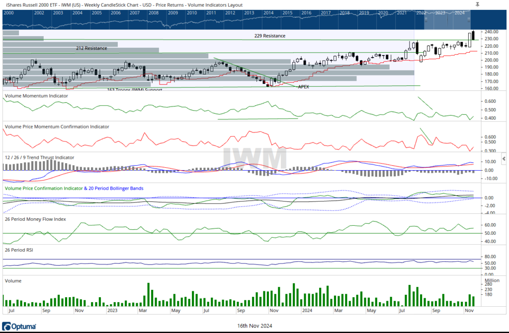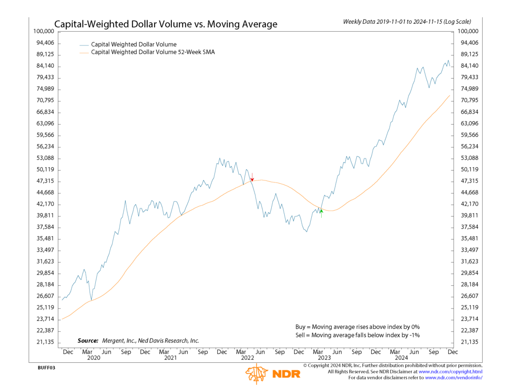 The market’s tactical retreat following the post-election rally may demonstrate a strategic repositioning rather than a full-scale rout. While all segments experienced losses, the brass commanders showed greater resilience compared to the more volatile frontline troops and generals. This evidence further supports our previous broadening themes initiated in June. The previous week’s explosive price action on low volume may suggest retail allocations were being withheld awaiting the election outcomes. This past week’s higher Capital Weighted Volume during the retreat suggests that larger institutional forces may be using this opportunity to distribute gains at more favorable prices.
