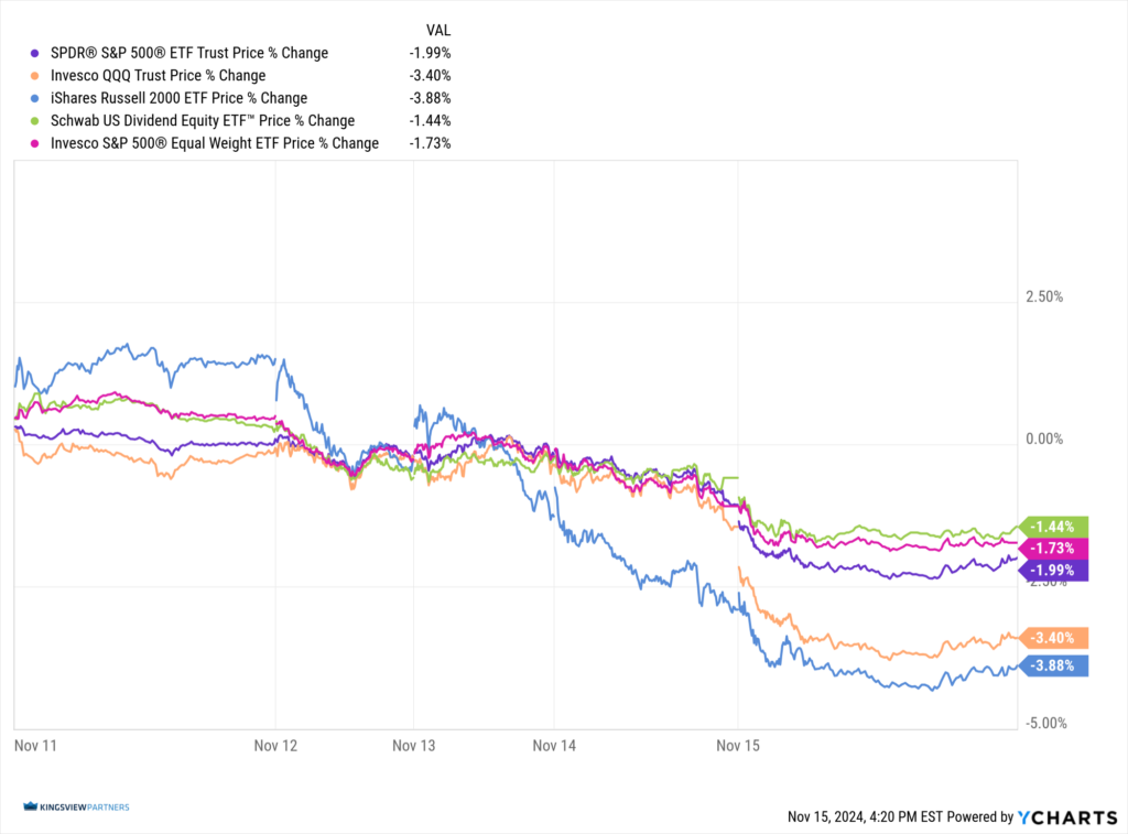 This past week, the markets executed a strategic withdrawal from the post-election offensive, relinquishing a portion of their hard-fought gains. The frontline troops (small caps) and the generals (large tech), who had led the charge during the election week assault, suffered the heaviest casualties during this tactical retreat. Meanwhile, the brass commanders (large caps and dividend stocks), who had advanced more cautiously during the initial push, demonstrated greater resilience in holding their ground.