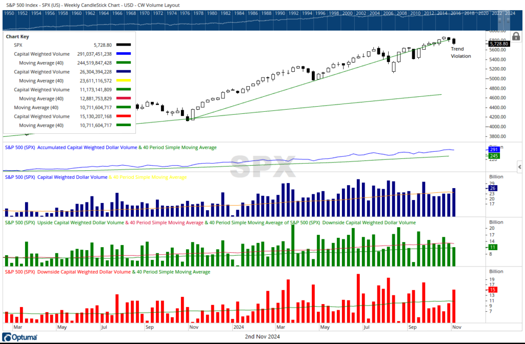 The bears orchestrated a powerful offensive, with over $15 billion in capital fleeing the S&P 500 battlefield, compared to only $11 billion in reinforcements. Thursday saw another heavy assault with a strong 10% Downside Capital Weighted Volume day, as $6.7 billion in bearish forces overwhelmed a mere $200 million in bullish resistance. This financial bloodbath occurred on the heaviest Capital Weighted Volume since the minor September correction.