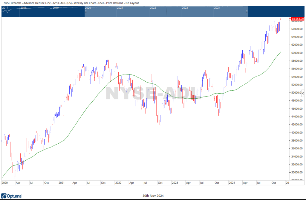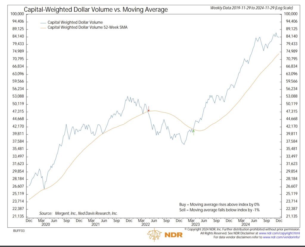 In this brief Thanksgiving week engagement, we’ve witnessed a divergence between the lagging movements of our command units and the hesitation in our supply battalions and new leadership within the ground troops. The Capital-Weighted Volume intelligence suggests potential supply line liquidity issues, with more resources moving away from the front than towards it. However, the NYSE Advance-Decline Line’s new high indicates broad participation in the overall campaign, potentially offsetting the short-term volume concerns since the Trump bump. Our long-range reconnaissance (leading indicators) continues to paint a picture of potentially favorable terrain ahead.
