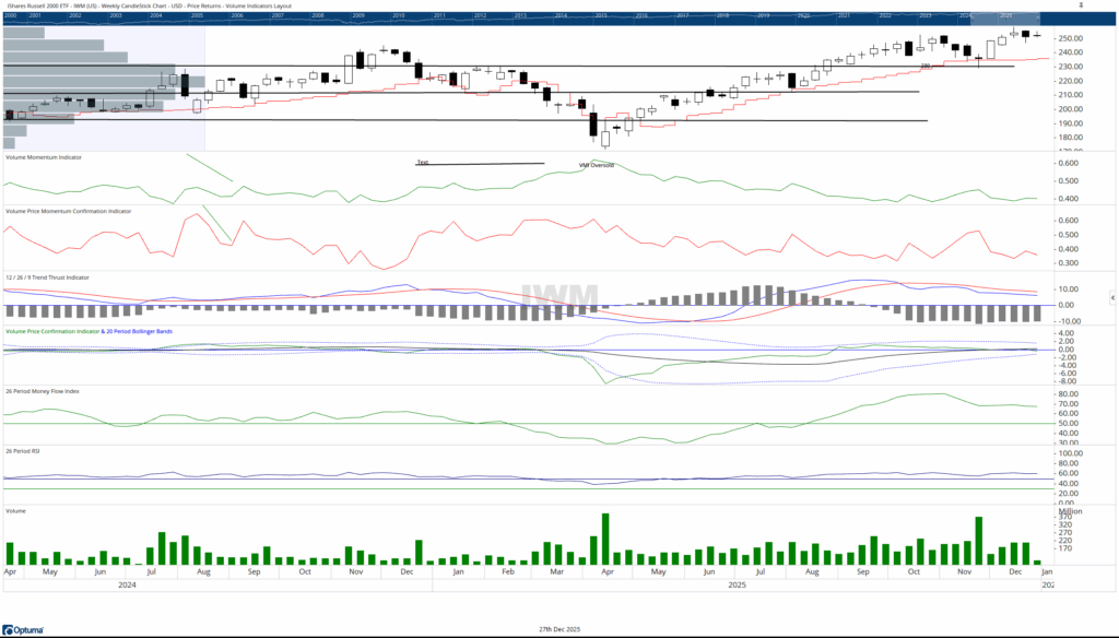During the shortened Christmas week, most units responded with modest gains, but only the S&P 500 Index successfully broke free of its recent range to press into new all-time high territory. While the S&P 500 price index achieved fresh ground, the supply lines told a more restrained story. S&P 500 Capital Weighted Volume came in exceptionally light, even accounting for only three and a half trading sessions, marking the lowest weekly Capital Weighted Volume total since 2024’s Christmas week. Despite the light activity, participation leaned positive, with 73% of CW volume to the upside and 69% of capital flows registering as inflows.