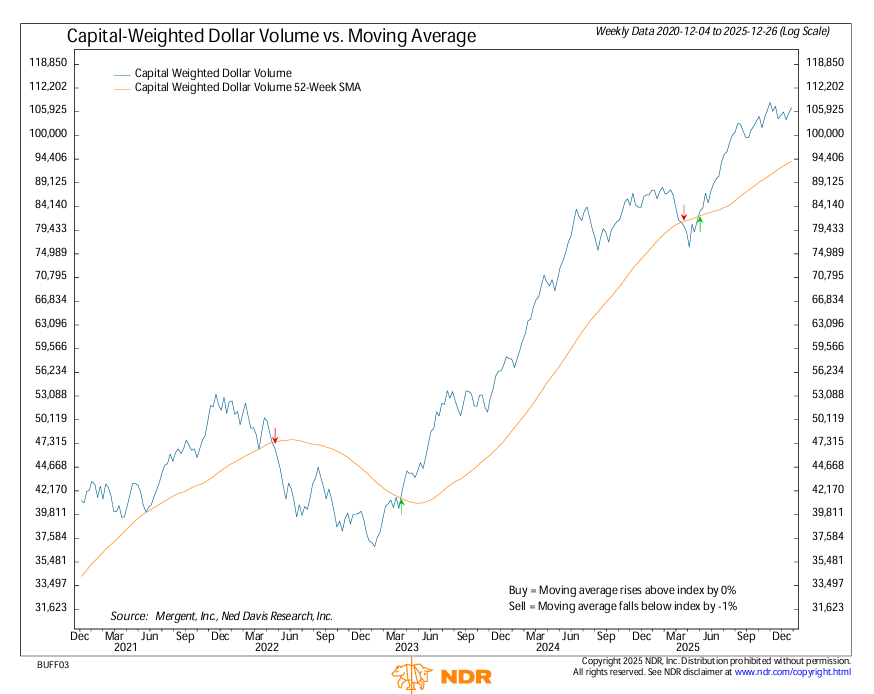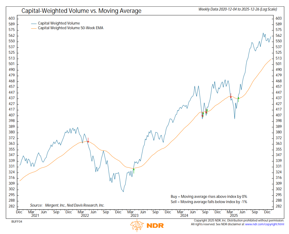 In the week prior, both S&P 500 Capital Weighted Volume and Capital Weighted Dollar Volume successfully held support and advanced. That action continued this week to form new short-term peaks, constructive in the near term. Yet both measures remain below their respective all-time highs. The S&P 500, meanwhile, continues to exceed its prior peaks, creating a subtle divergence that suggests hesitation beneath the surface. On a longer-term basis, however, price and volume remain largely aligned. The S&P 500 Index stands roughly 10 percent above its 50-week moving average, while Capital Weighted Volume and Capital Weighted Dollar Volume remain approximately 9 percent and 11 percent above their weekly respective trend lines.