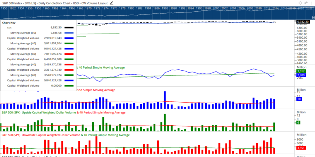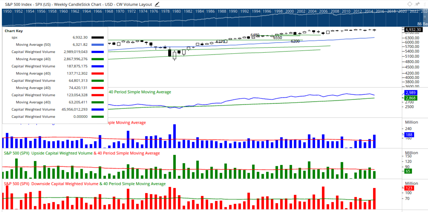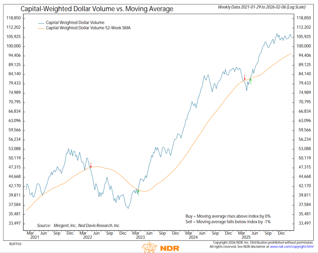 From a volume perspective, the previous week’s unusually light participation gave way to growing engagement as this past week progressed. Thursday marked a decisive bearish strike, registering a 90% downside Capital Weighted Volume day. Friday delivered a seemingly sharp counterattack, with the S&P 500 rallying nearly 2%, yet only achieving 70% upside volume. On balance for the week, more than 65% of both Capital Weighted Volume and Capital Weighted Dollar Volume flowed to the downside. Importantly, both accumulated volume trends have curled lower, though they remain above their rising troughs, suggesting pressure without breakdown confirmation.