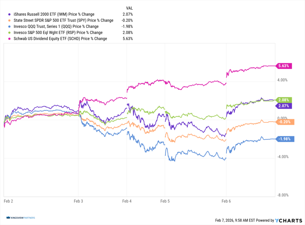Updated: 2/9/2026. Historical references do not assume that any prior market behavior will be duplicated. Past performance does not indicate future results. This material has been prepared by Kingsview Wealth Management, LLC. It is not, and should not, be regarded as investment advice or as a recommendation regarding any particular security or course of action. Opinions expressed herein are current opinions as of the date appearing in this material only. All investments entail risks. There is no guarantee that investment strategies will achieve the desired results under all market conditions and each investor should evaluate their ability to invest for the long term. Investment advisory services offered through Kingsview Wealth Management, LLC (“KWM”), an SEC Registered Investment Adviser.