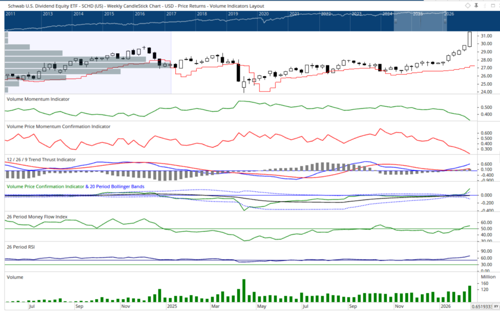 A similar divergence unfolded within the broader S&P 500 structure. The State Street SPDR S&P 500 ETF Trust slipped -0.20%, while its equal weight counterpart, the Invesco S&P 500 Equal Weight ETF, surged 2.08%. Most striking, however, was the renewed leadership from the brass commanders. The Schwab US Dividend Equity ETF vaulted 5.63% on the week, decisively assuming command. Collectively, this action reinforces the themes of broadening out and down, while simultaneously reviving echoes of our “And Then There Were None” theme dynamics observed during mid-2024 and 2025.