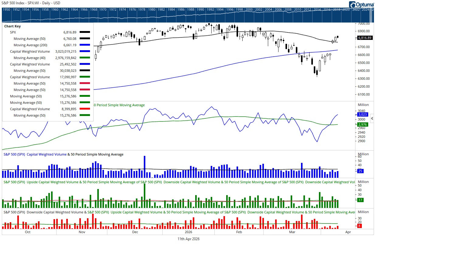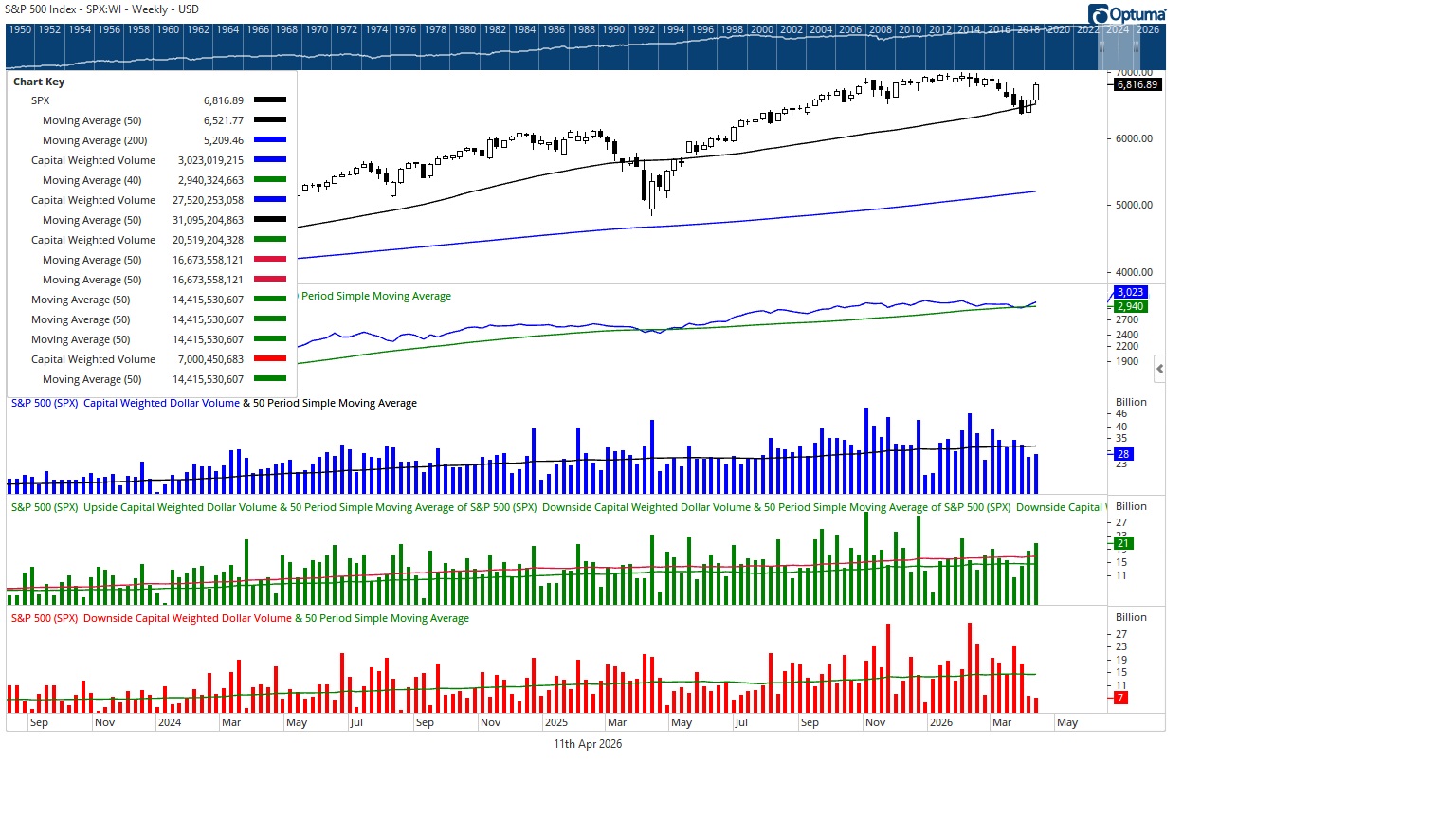 In practical terms, the week began Wednesday, April 8th, with a decisive bullish gap higher in the S&P 500. The advance was supported by a 90% upside Capital Weighted Volume day on above average upside volume, though total volume remained only average. The rally delivered strong upside participation relative to downside, yet overall activity remained muted, with below-averagetotal volume.