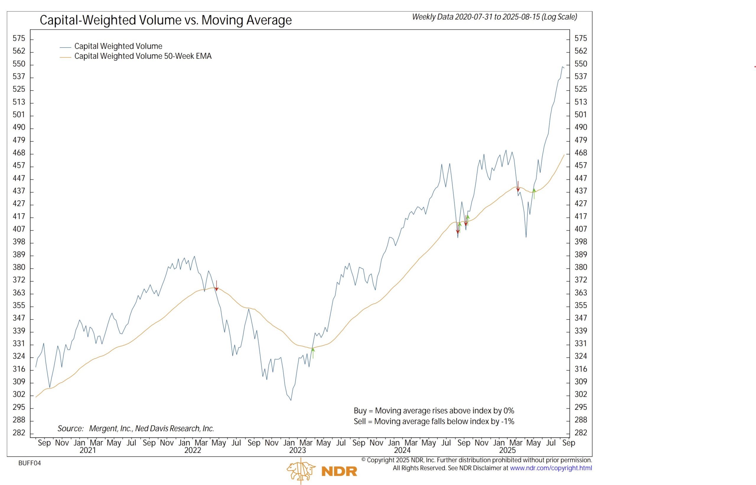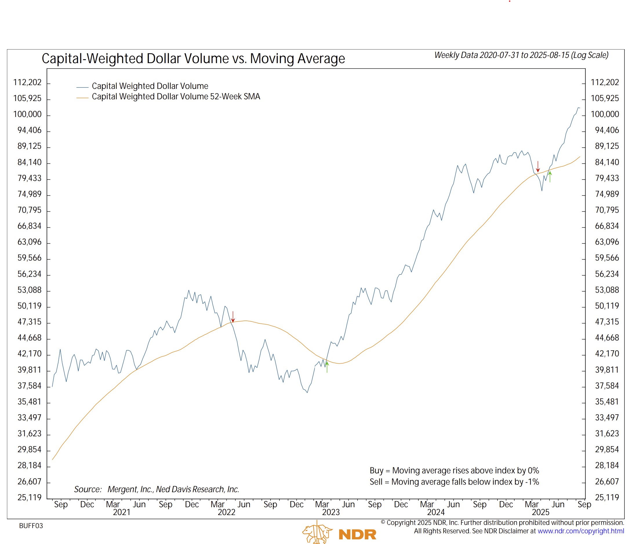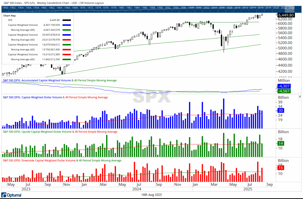 While the whole field advanced this week, supply lines painted a murkier picture. Capital Weighted Volume came in slightly below average, yet Capital Weighted Dollar Volume (Capital Flows) registered slightly above average. Inflows for the S&P 500 were only at average levels and were overrun by above-average outflows. Similarly, downside volume led upside volume by a seven-to-six ratio, though overall activity was muted on below-average total Capital Weighted Volume. Despite this week’s setback, the longer-term accumulated trends in both Capital Weighted Volume and Capital Weighted Dollar Volume remain significantly above their price counterparts, showing volume leadership is still pressing ahead of price action.