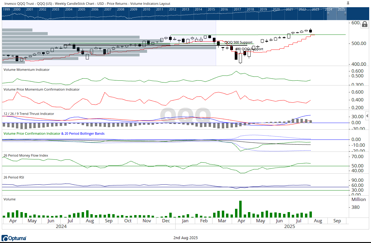 Among the units, the troops failed to break through the 230 resistance ceiling and now hover just above the critical 210 support line in the sand. Volume at price analysis reveals a heavy buildup of prior support near 208, making this zone strategically important. Meanwhile, the generals closed the week near their lows, forming a bearish engulfing pattern. If QQQ fall further, holding above 540 becomes mission-critical for maintaining control of the short term campaign. Meanwhile, the S&P 500 also closed near support at 6200 and printed its own bearish engulfing candle. Key supports now lie at 6100 and 6000, with 6059 and 5940 representing zones to watch closely.