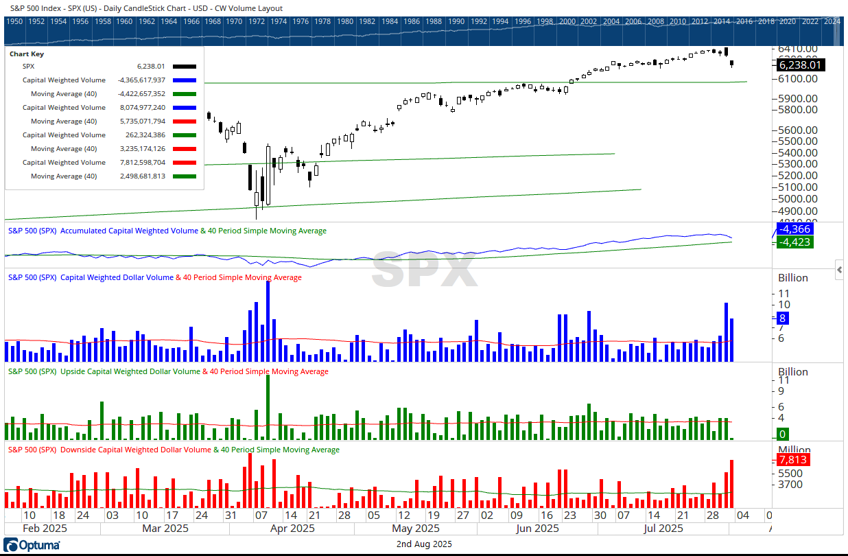 The bullish month of July ended not with a fanfare, but with a fading chord. On the final trading day, the S&P 500 set new intraday highs only to finish the session near its lows, closing the month on a sour note. Capital flows were the strongest since the historic April 9th reversal day, but unlike then, the direction was not so one-sidedly bullish. Capital Weighted Volume was above average, with 64% being outflows. It was a turn of tone that echoed a verse from Landslide with hope turning quietly into uncertainty.