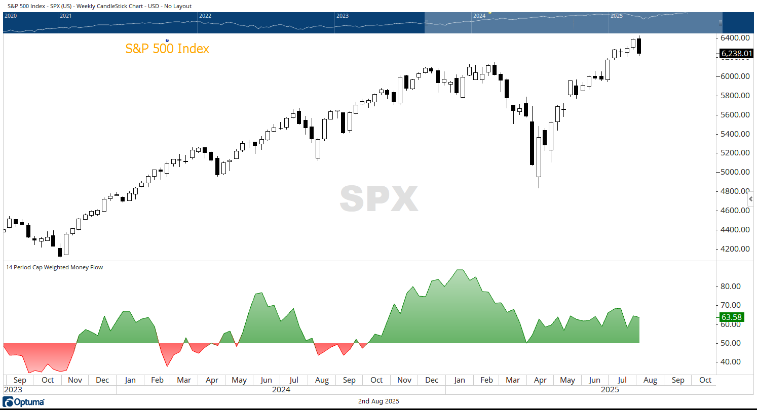 However, this week’s action did impose damage to breadth. The NYSE Advance–Decline Line erased not only last week’s progress, but the entire breadth gains made during July. While it remains in an uptrend, its momentum is now bending downward. That shift should not be ignored. Another sign of internal weakness lies in volume-price momentum. The Capital Weighted Money Flow Index (CW-MFI), one of our proprietary leading indicators, has been diverging bearishly from price since the former January highs. After peaking on January 12th, CW- MFI fell to its zero line (50 reading) one week before the April bottom, then bounced corresponding to the price bottom. But since the post-correction high on July 11th, CW-MFI has trended lower again. It now teeters towards the zero line once again. Whether it holds or breaks beneath may be a crucial data point to watch. A bounce could potentially reignite bullish momentum, but a break may suggest a deeper rotation is underway.